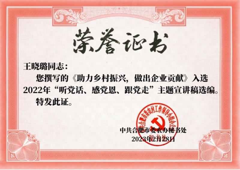 近日,由市委农办、市委宣传部等七部门联合举办的“听党话、感党恩、跟党走”主题教育活动宣讲稿选编结果正式揭晓。合肥路桥王晓璐同志撰写的《助力乡村振兴,做出企业贡献》成功入选。